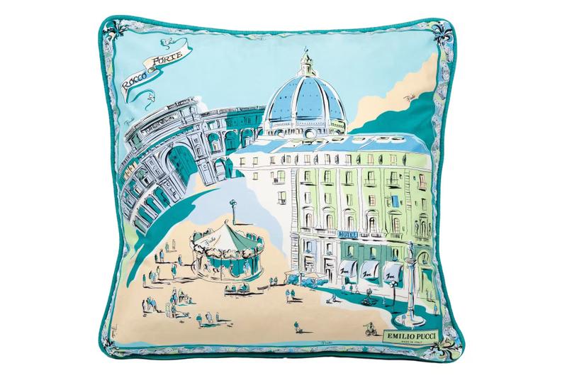 Já o item de casa tem a mesma proposta do lenço, com os mesmos pontos de referência estampados, feito de seda twill e tamanho 47 x 47 cm. Cada peça é apresentada como item de colecionador, com tag “Emilio Pucci Made in Italy” e produção artesanal na região do Lago de Como, segundo a loja.
