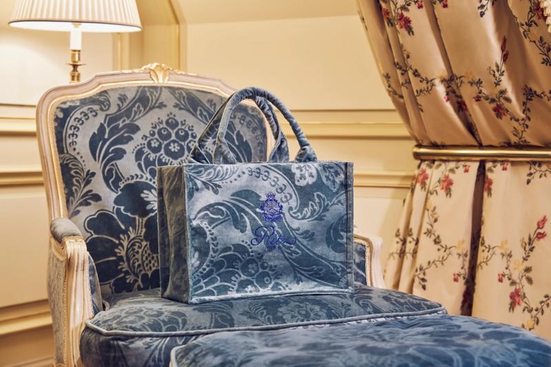 O Ritz criou também uma coleção de bolsas upcycled, em formato tote, feitas com tecidos de estofaria reaproveitados do próprio hotel. São 40 unidades únicas, numeradas, confeccionadas a partir de cortinas, colchas, almofadas e estofados históricos com os mesmos tecidos no estilo rococó francês Luís XV utilizados nas suítes e salões, de acordo com a hospedagem. Cada bolsa traz o brasão do Ritz bordado à mão, cores que remetem à paleta do hotel e é vendida exclusivamente na butique física da Place Vendôme.