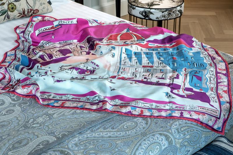 Um dos destaques quando se trata dos produtos físicos são os lenços e a almofada de edição limitada da grife Emilio Pucci, criados especialmente para o Hotel Savoy, em Florença. O acessório fashion exibe uma estampa que retrata a Piazza della Repubblica (Praça da República, no centro da cidade), o Duomo e o próprio hotel. Além disso, é feito 100% de seda, bem como variações de cor rosa vibrante e azul-turquesa, de acordo com o site.